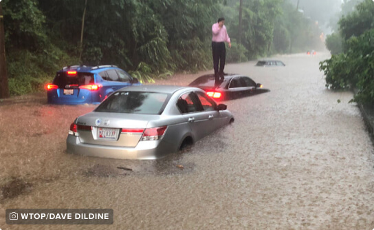 On September 10, 2020, a half foot of rain fell in Washington, DC, causing the levels of local streams to rise eight feet in one hour. Emergency responders in Montgomery County, Maryland received 150 calls of motorists stuck in high water or needing water rescues.
