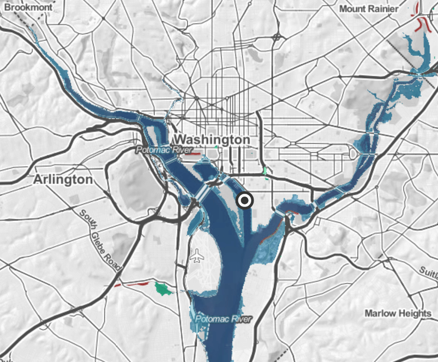 Over 1,300 acres of Washington, DC – nearly the size of Rock Creek Park – lie below the predicted high tide line in 2030, including the Southwest, Greenway, and Foggy Bottom neighborhoods. This area represents $4.6 billion in property value with over 400 homes, 21 miles of road, two military facilities, one hospital, and 12 federally listed hazard sites, such as waste dumps and sewage plants (Strauss et al., 2014).