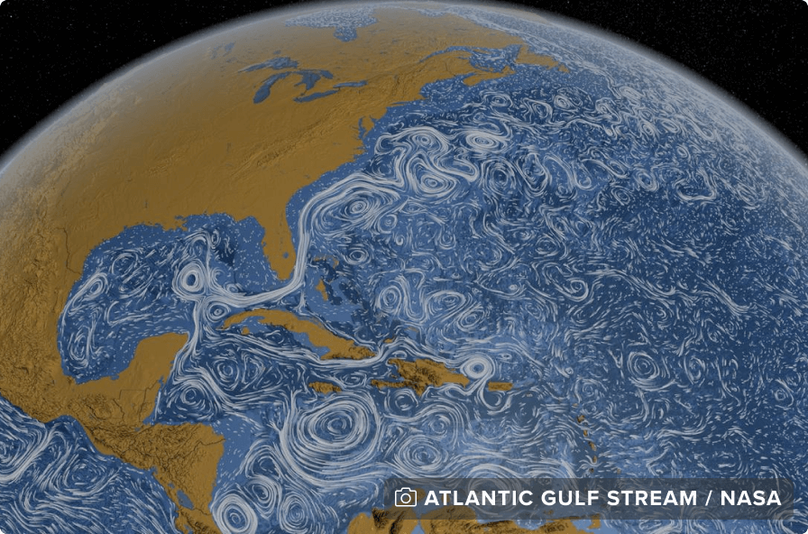 The Gulf Stream is a powerful ocean current that originates in the Gulf of Mexico, bringing warm water up the entire length of the eastern U.S. seaboard, then sending it across the Atlantic to the waters surrounding the British Isles.